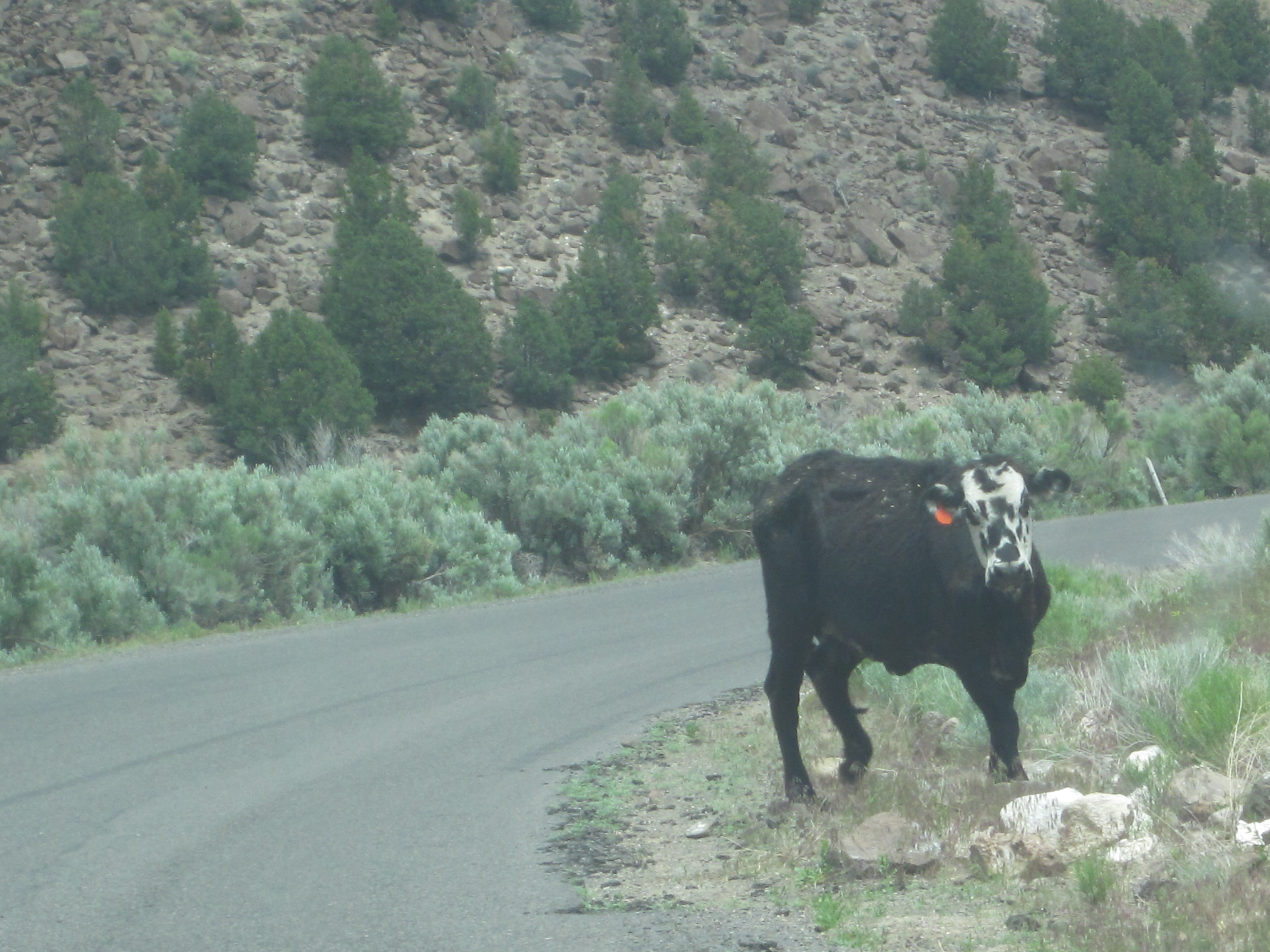 We turned around messily and chugged back towards the main road as quickly as we could, more nervous now and ready to get out of there. We left Widtsoe behind in the dust and happily continued until our “route” met back up with a more populated expanse of land. By “populated”, I mean that we had to stop several times to allow cows to cross the road. I guess we’ve gotten used to weird by now.