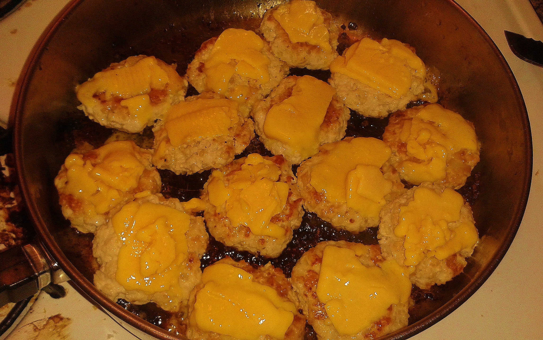 Back to your sliders, once you have cooked through the entire bowl of ground turkey, return the sliders to the pan over low heat. Slice hearty pieces of the sharp cheddar and cover each slider. Place the lid over the pan and heat until the cheese begins to melt slightly.