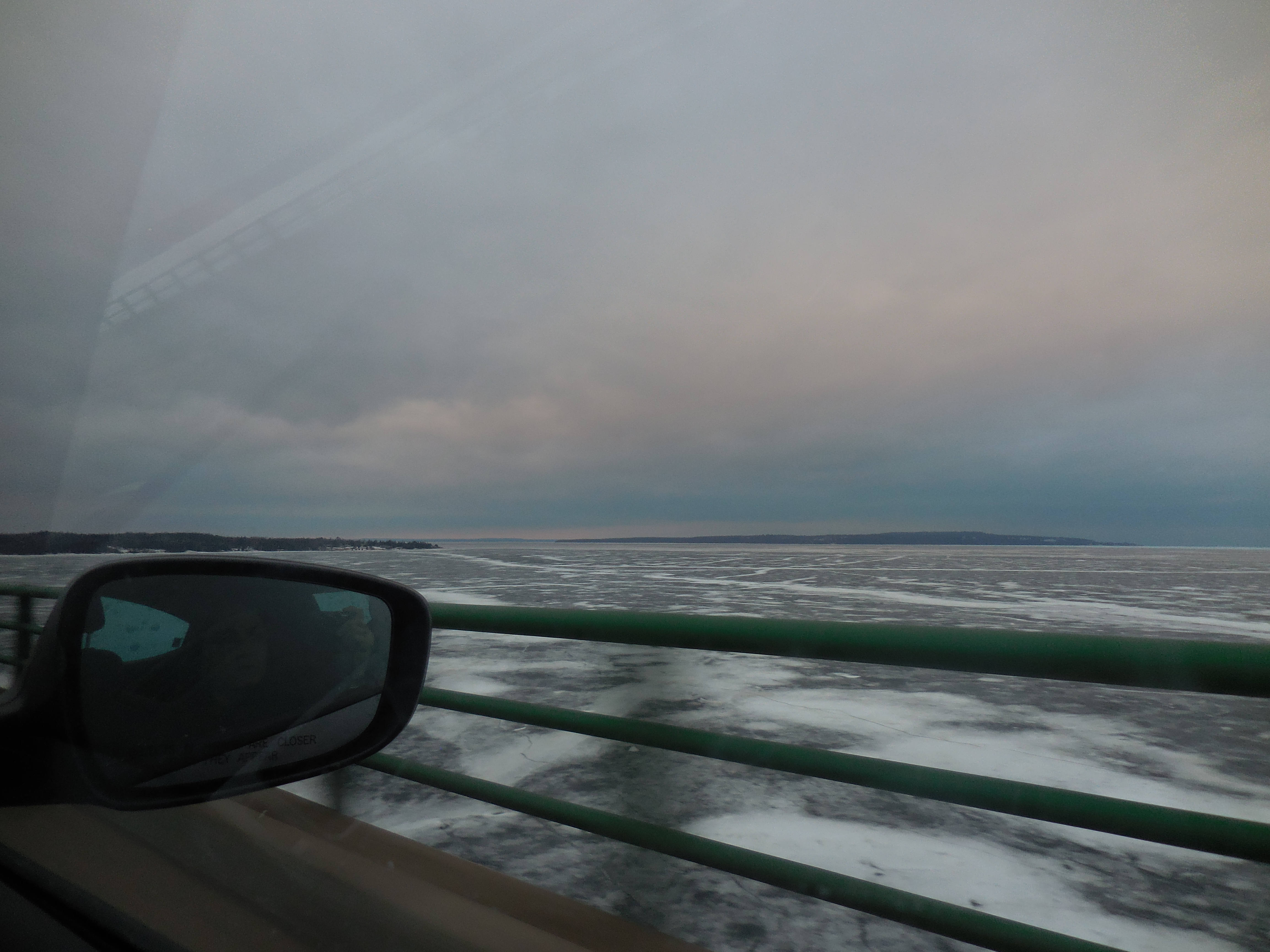 After a couple hours of smooth sailing, and feeling calmed by the comfort of the road, we landed in Mackinaw City at the foot of the 5-mile bridge that would cross the lake. We pulled off at a lakeside viewing area and tromped through a few mounds of unplowed snow to snap some pictures. The sun was 30 minutes from setting, and the sky glowed with shades of light purple and pink, and the bridge shimmered alongside the frozen lake. The town also lay frighteningly quiet, with only the whispers of chilly breeze to dance around our cameras. One deep breath to absorb the Zen of that rare quiet, and we continued on across the skinny bridge for a full and immersive experience of being surrounded by endless ice.