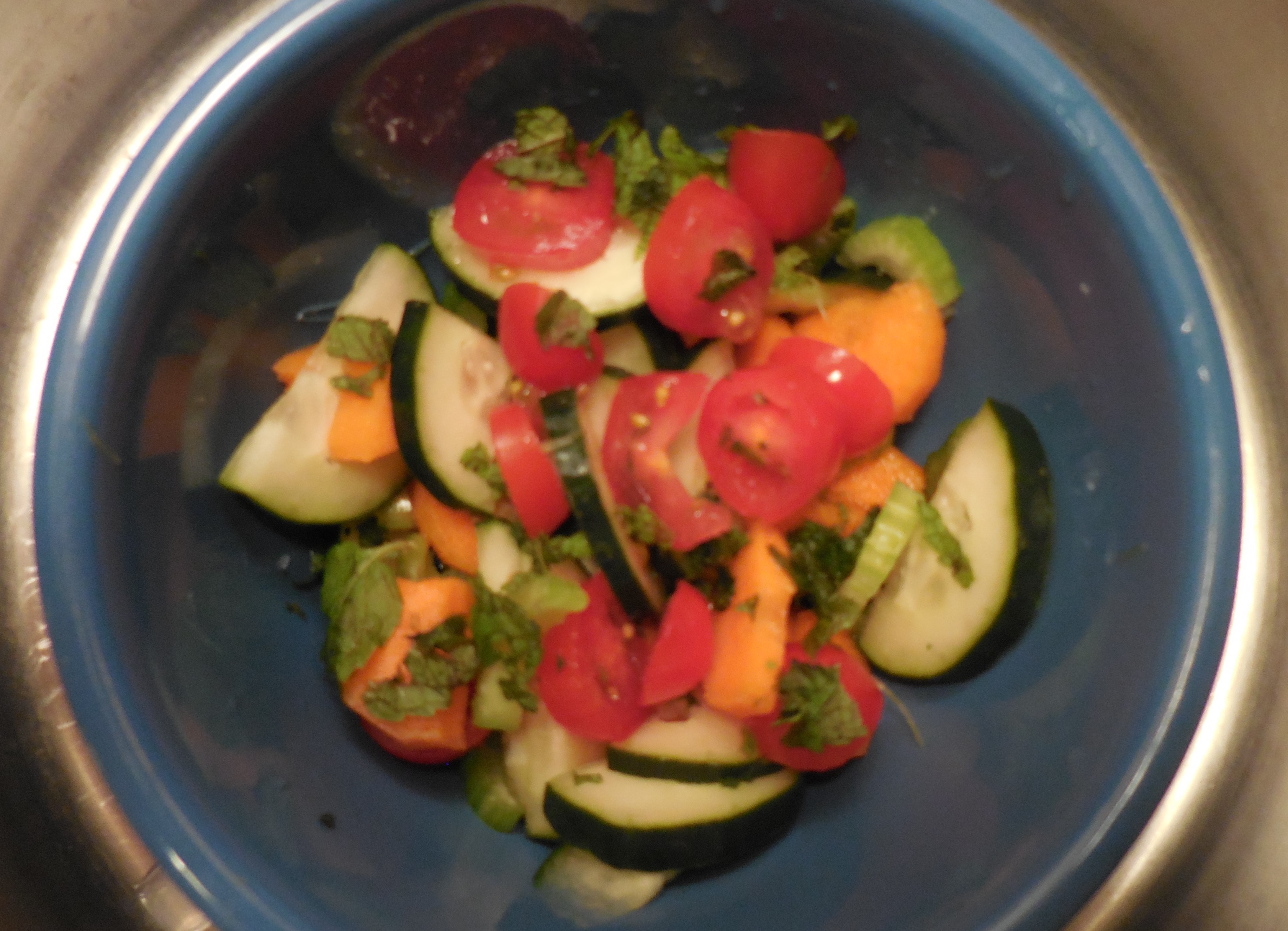 Start with the salad. Combine chopped celery, carrots, cucumber, cherry tomatoes, mint leaf pieces, lemon juice, zest, and a little salt into two small bowls. Toss to coat with lemon and leave to sit.