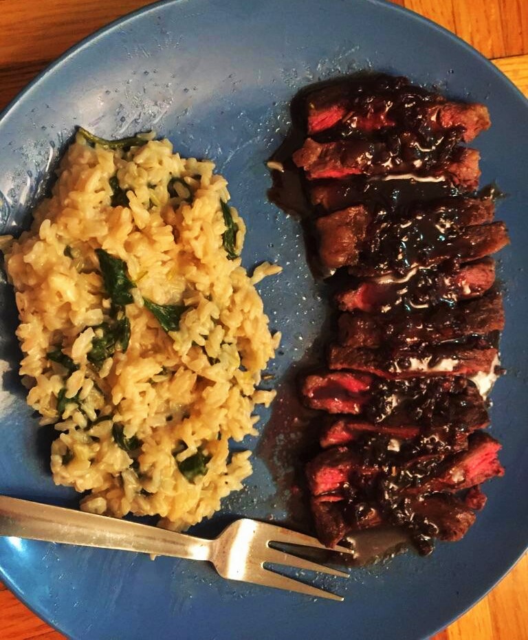 -Remove the garlic slices from your skirt steak and slice it thinly, spooning all the sauce and shallots over it. Serve alongside the rice “hash”, which provides a hearty and flavorful starch to offset the tangy reduction.