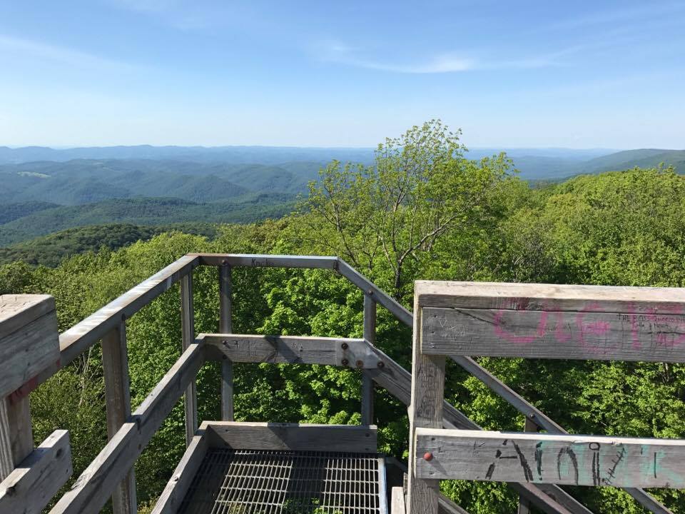After 20 minutes of lumbering and just when I thought we couldn’t possibly be on the right “road”, we came to a sign for Bickle Knob. Parking in the small clearing at the top, we walked about 500 feet down a skinny gravel pathway to a tall, old metal structure that had been plopped down in between the trees. It looked like the base for an old water tower with a flat top. Holding onto the creaking railing with trepidation, we slowly made the climb towards the flat platform at the summit. Once we got there, it felt like we were sitting on top of a mountain. It was silent except for the sound of the warm breeze as it whirled through trees and clipped the hilltops. Birds chirped alongside the faded sound of a train far out into the distance. It was crisp. Along the horizon was a white glow from the sun, masked by light fog and a faded view of windmills. I could have stood there forever.
