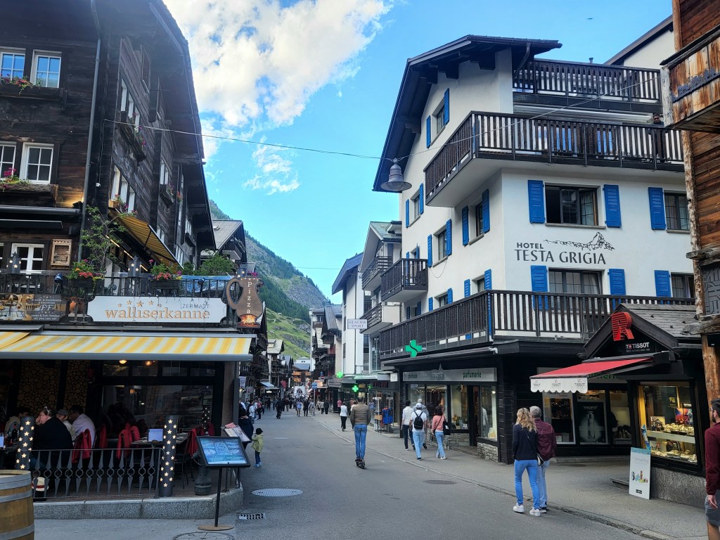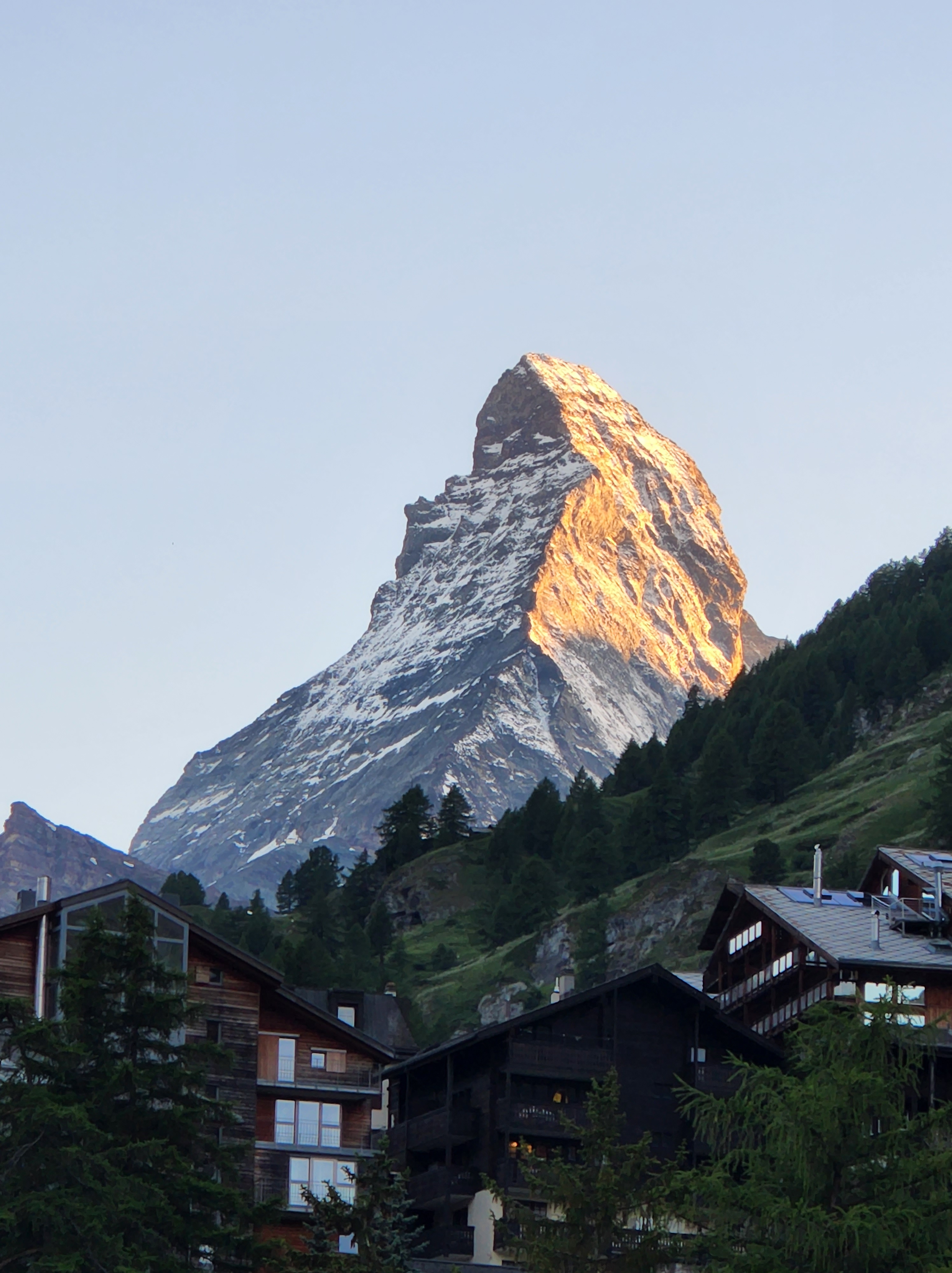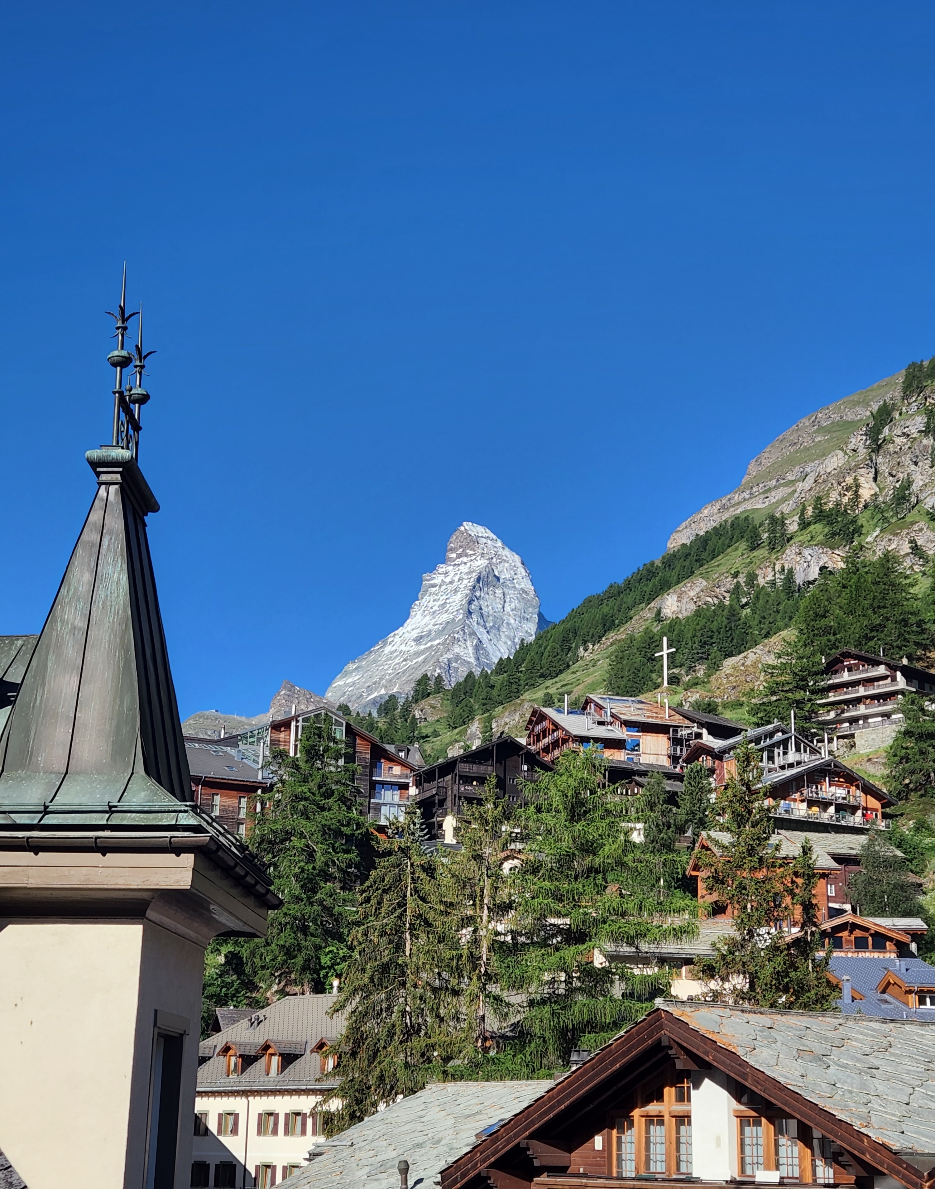 Despite the crushing level of beauty around me, it’s been difficult to settle. What else is new? Sometimes my brain just doesn’t cooperate. It’s like I left it back on the airplane. I had to pause tonight and remind myself what I was grateful for, over and over again. The freedom and privilege of traveling at all. Air that’s clean. My wife. My health….the thing that none of us should ever take for granted. When I’m off-kilter, I can’t just “write eloquently”. Certain moments or experiences feel irritating and fleeting when they should feel idyllic. And I try to be honest when I document things. But then in another moment, it can all suddenly connect, and I have that deep exhale. Like it was waiting in the shadows. At the peak of the Matterhorn as seen from our wooden balcony, iced in snow. Or the vertical walls of rock that feel like they’re protecting this little town. Sometimes it is idyllic.