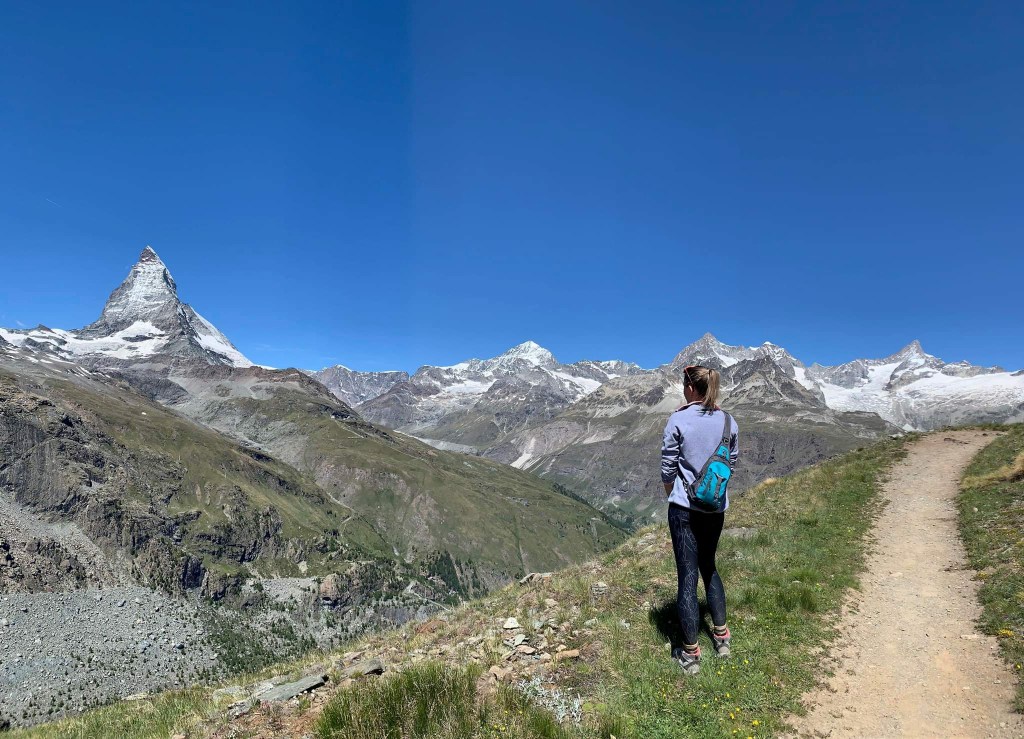 We stepped off the train and walked towards Riffelsee Lake along a narrow path, about 5-10 minutes away. The water was a blazing color, creating a reflection of the mountains that looked like a mirror. A nearby path just behind the lake had no sign, so we followed it curiously for a few minutes until we were away from every other hiker. Our reward was a view into infinity. This is the scenery that I dream of weekly, ache for. Along a skinny path at the literal foot of the mountains. A piercing blue sky behind blinding white peaks. Palpably alone. It woke up the dormant part of my soul.