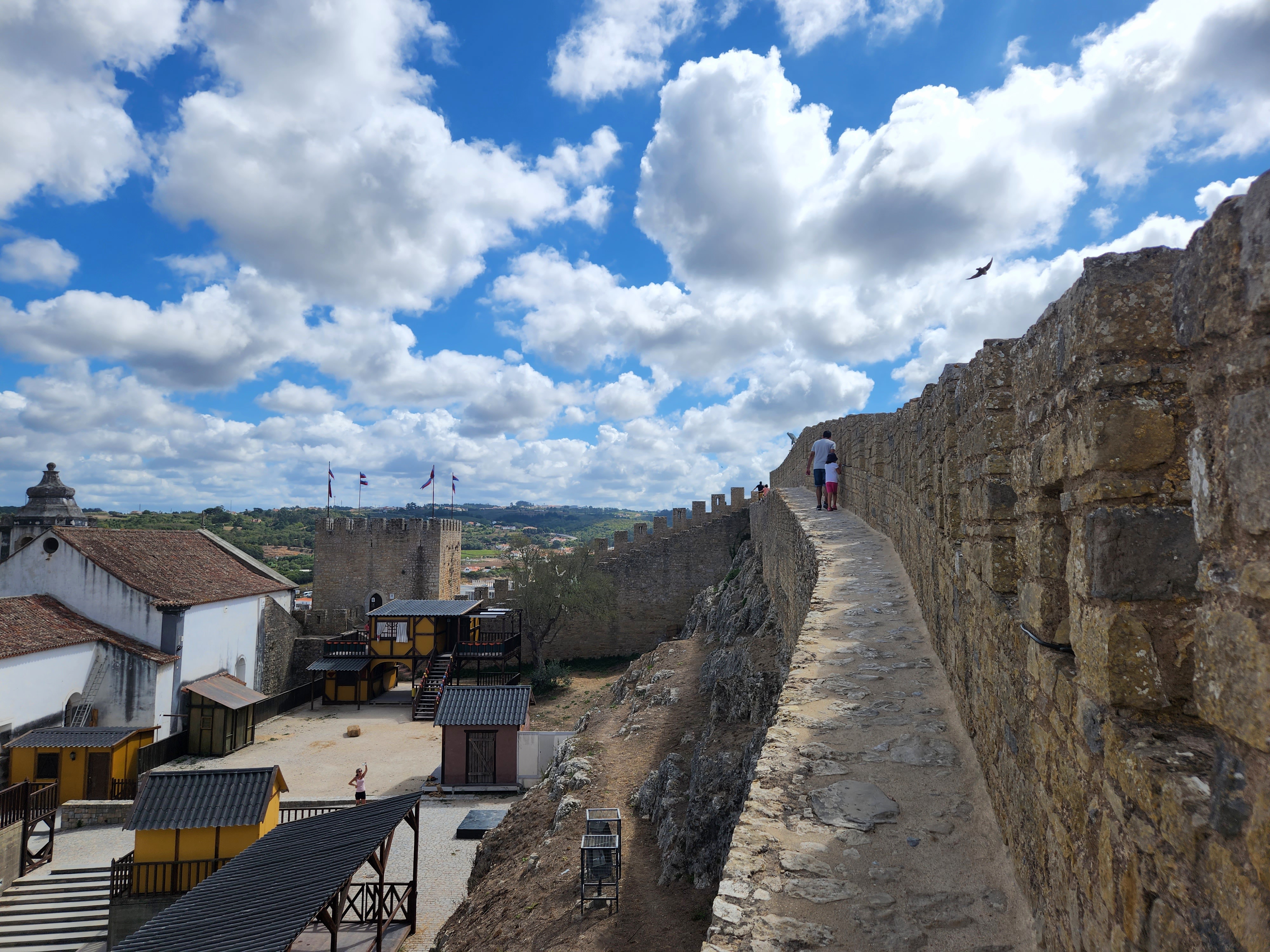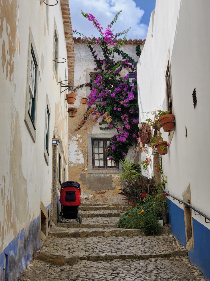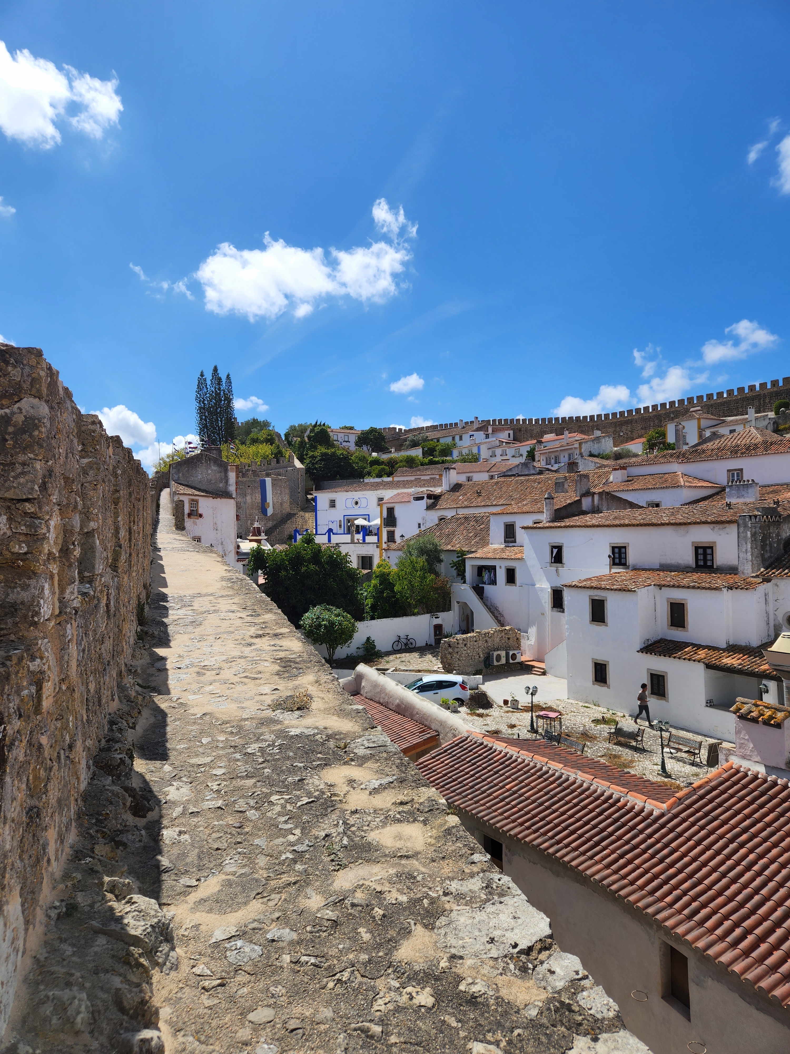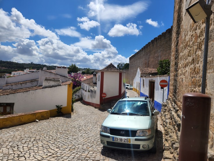 We left Lisbon and picked up our rental car to drive to Obidos. Portugal drives on the right side of the road which inevitably eases my “new country driving” anxiety, but once you leave major highways you can see why people hesitate to self-drive. Obidos is a small village surrounded entirely by castle walls, so only the bravest attempt to park inside of town “proper”. We went searching for a parking lot but managed to pass our street as the road turned to complete cobblestone and narrowed significantly. We clobbered forward alongside the castle walls to our left, easing our way past stone walls on a road barely wide enough for a small car. The cobblestones were uneven and dipped in places. Somehow, we managed to find a spot right up against the castle wall like a parking miracle. We later learned where the big parking lot was that we had missed, but I like to think that parallel parking between slabs of 12th-century stone was more character building.